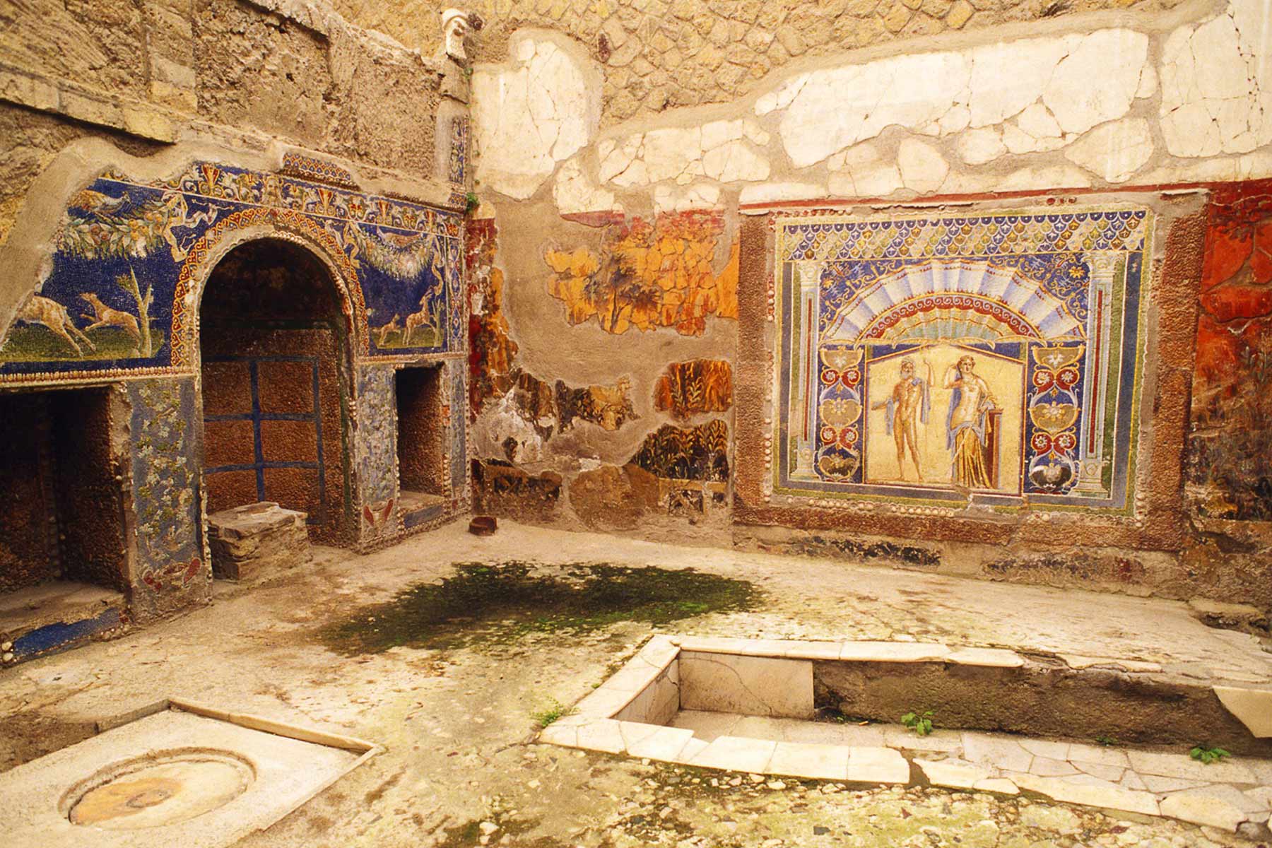 Herculaneum was a holiday destination for the Roman aristocracy, a small chest full of miracles. In its private residences and public buildings were found marble decorations, wall paintings, mosaic floors as well as objects implemented in the everyday life. The city was destroyed in just few minutes during the Mt. Vesuvius eruption in 79 A.D. Pompeii, Oplontis and Stabiae were destroyed either. A lush city was instantly buried by a pyroclastic avalanche and a thick blanket of mud had rested over it for the centuries to come.