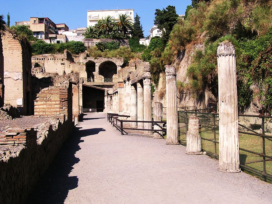 Herculaneum is much smaller but better preserved than Pompeii. While Pompeii had been covered in four to five meters of ashes, an avalanche of muds 20 meters thick had buried Herculaneum. Second floors of the buildings, carbonized wooden objects, intact paintings and mosaics are still preserved. The site gives a vivid impression of the opulent lifestyle enjoyed by the wealthier citizens of the Roman Empire. It is worth to visit it to get an idea of how the Romans lived in the imperial period.